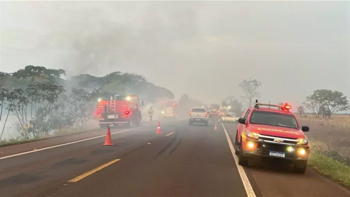 Um veículo modelo Meriva pegou fogo às margens da BR-060, na saída para Sidrolândia, em Campo Grande, após colisão com uma Ford Belina, na madrugada desta terça-feira (7).