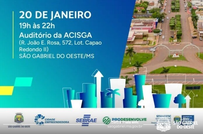 O município de São Gabriel do Oeste realiza, no dia 20 de janeiro, o lançamento oficial do Plano de Desenvolvimento Municipal (PDM), uma iniciativa estratégica do Programa Cidade Empreendedora, desenvolvida em parceria entre o Governo do Estado, por meio da Semadesc, o Sebrae/MS e a Prefeitura Municipal. O evento acontece das 19h às 22h, no Auditório da ACISGA.