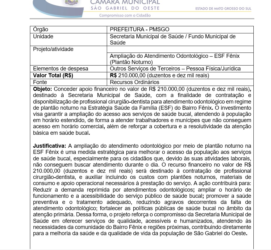 A população de São Gabriel do Oeste deve contar com atendimento odontológico em horário noturno na Estratégia de Saúde da Família (ESF) no bairro Fênix A medida será viabilizada por meio de emenda impositiva do vereador Geraldo Rolim, no valor de R$ 210 mil.