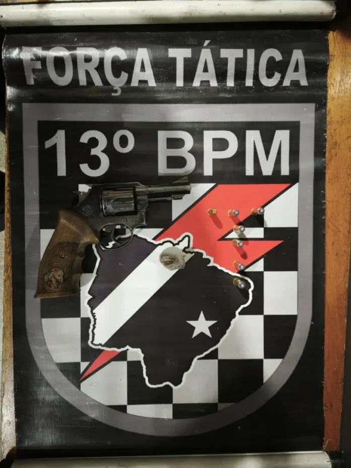 Ao procederem a vistoria nos itens infantis, os policiais localizaram um revólver calibre .38, marca Taurus, municiado com seis cartuchos intactos, além de uma munição extra e uma porção de substância análoga à maconha. O armamento estava escondido em meio à manta que envolvia a criança.