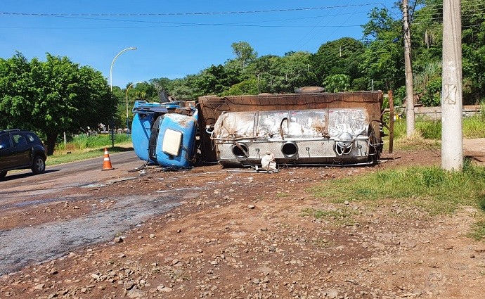 InícioCidadesCamapuã: Caminhão carregado de leite tomba na BR-060