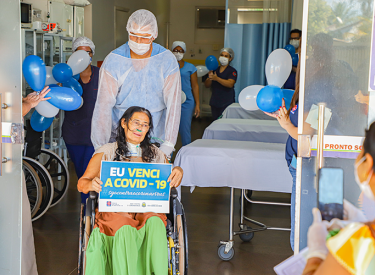 Com lágrimas de alegria, ela agradeceu aos profissionais que estiveram ao seu lado durante toda a internação no Hospital. “Toda equipe sempre foi muito educada. Cuidaram de mim com tanto amor e atenção desde que apresentei os primeiros sintomas e após o agravamento da Covid. Eu não achava que ia conseguir passar pela doença, mas com a força de Deus, dos meus familiares e dessa equipe, hoje estou aqui para falar: eu venci a Covid-19!”, disse a senhora.