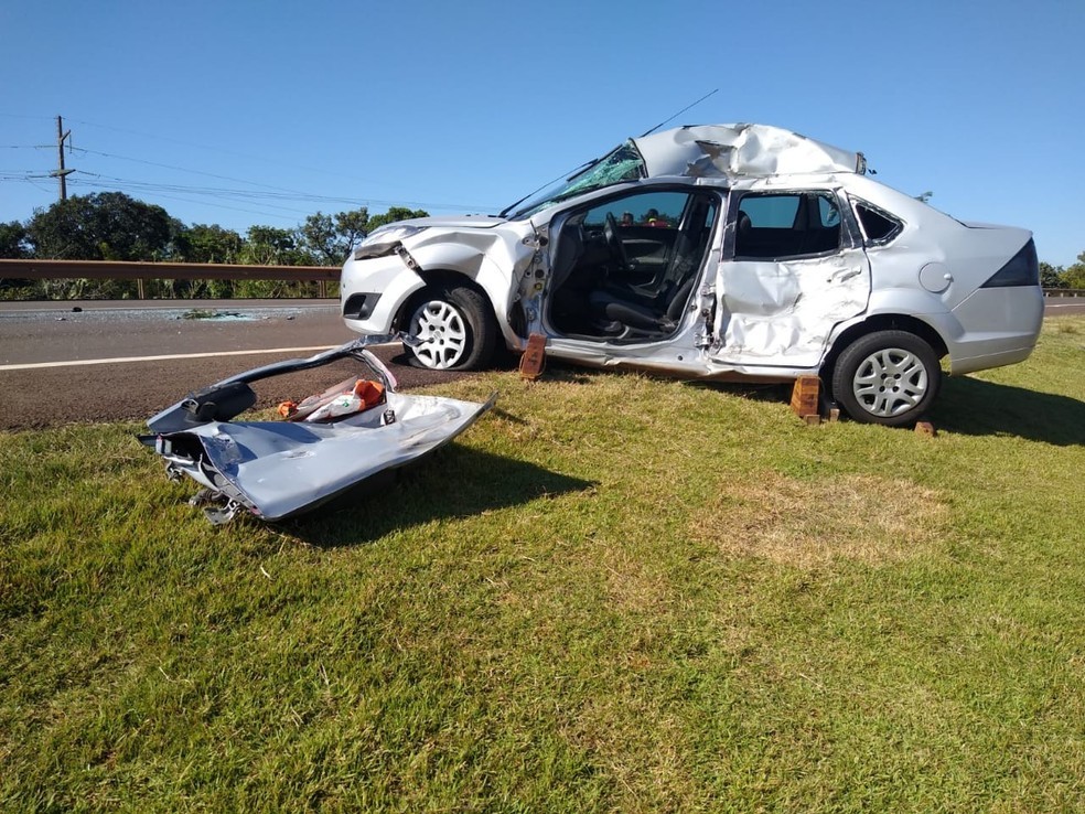 O carro parou entre o canteiro central e o acostamento da rodovia e teve a frente e a lateral esquerda danificadas.