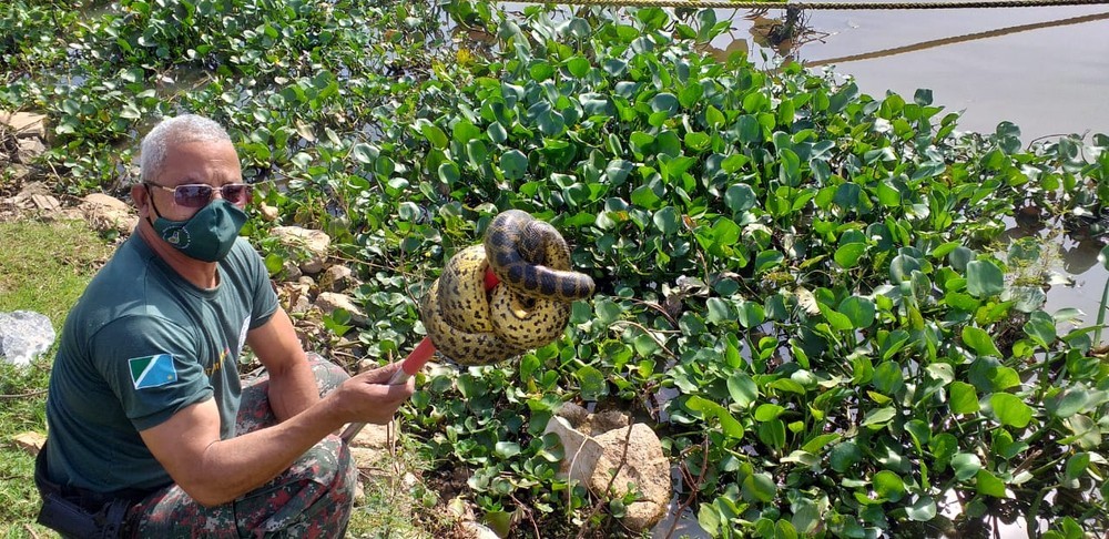 Os policiais, com uso de uma pinça especial, colocaram a sucuri-amarela, da espécie Eunectes notaeus, em uma caixa de contenção. A equipe da PMA também ressaltou que o animal estava sadio e, por isso, ele foi solto em uma vegetação aquática no rio Paraguai, distante da cidade.