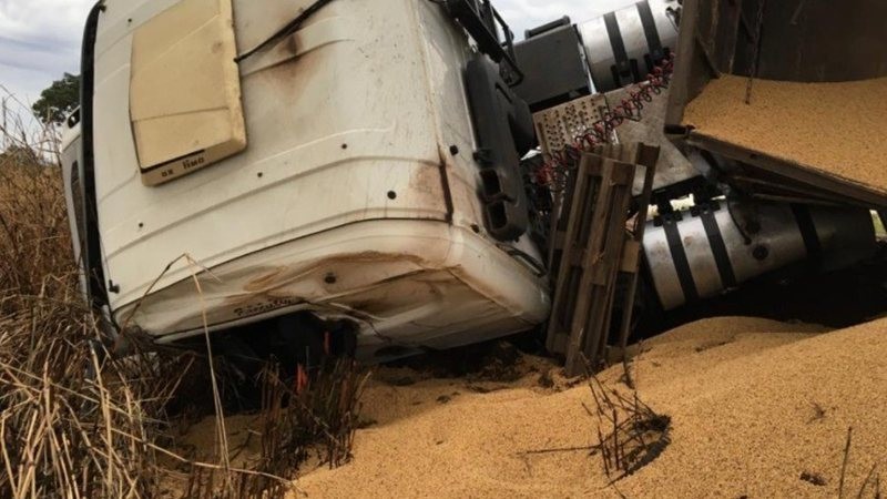 Com a carreta desgovernada, o veículo tombou e a carga de grãos ficou espalhada pelo local. O motorista não ficou ferido. A carreta foi removida do local no início da noite, com auxílio de um guincho.