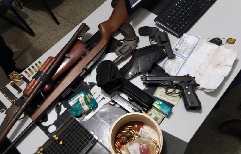 Foi montada uma força-tarefa com policiais civis de Chapadão do Sul e policiais civis e militares de Água Clara para deslocamento até a fazenda. No local foram encontradas diversas armas de fogo: 1 revólver cal 38, 1 revólver cal 32, 01 espingarda cal 28, 1 espingarda Winchester cal 22 e 1 pistola cal 9mm, além de grande quantidade de munição de calibres diversos.