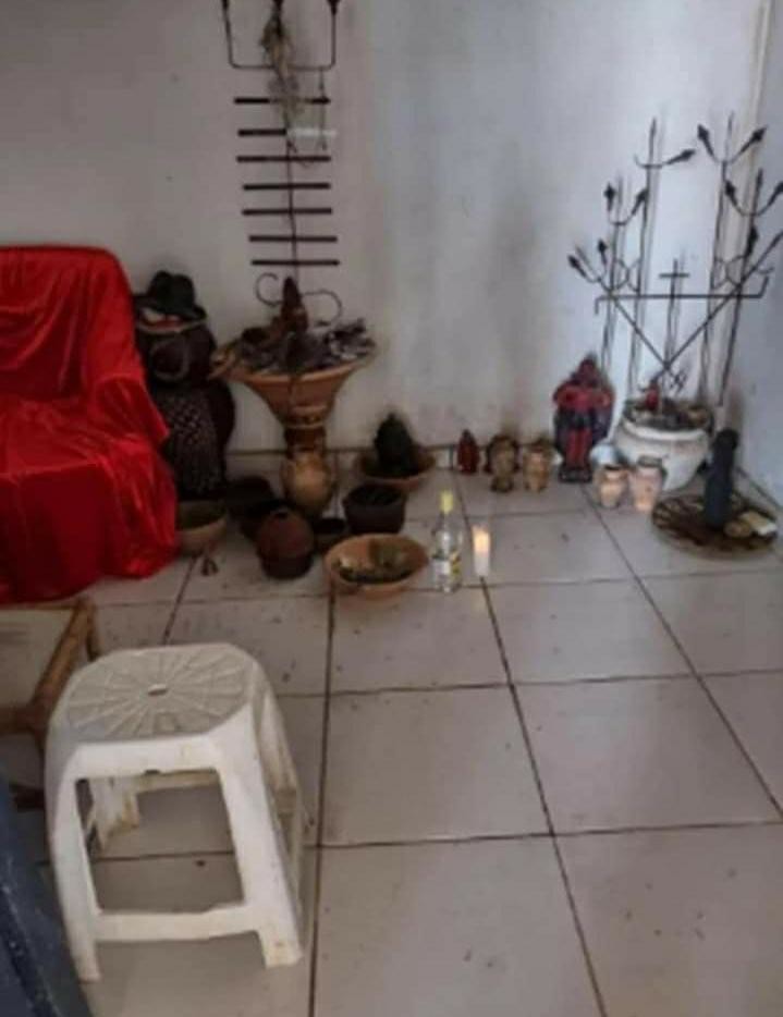 Nas buscas feitas no imóvel em que a mãe de Lázaro morava, em uma área rural da região conhecida como Girassol, os policiais se depararam com altares e tigelas de barro com dinheiro e cachaça. Também havia pentagramas desenhados no chão e uma cruz invertida, cenário reproduzido em dois dos seus esconderijos.