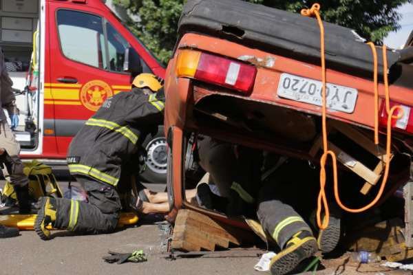 Conforme as primeiras informações apuradas no local, o acidente entre um Escort e um Uno resultou no capotamento do Escort vermelho, ocupado por um casal. As duas vítimas ficaram retidas no veículo e o Corpo de Bombeiros foi acionado.