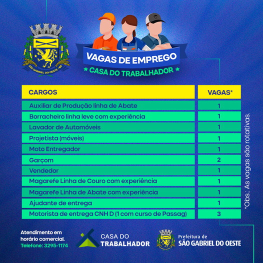 A Casa do Trabalhador em São Gabriel do Oeste funciona em horário comercial no prédio da Prefeitura Municipal na rua Martimiano Alves Dias, 1211. Mais informações, tanto para o contratante quanto para o candidato a uma vaga de emprego, podem ser obtidas pelos fones: 67 99827-5371, 67-3295-2018 ou 3295-1174.