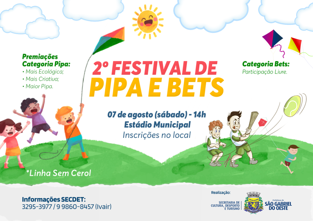 Desta vez é o 2º Festival de Pipas e Bets que está programado para agitar o final de semana de crianças, jovens e adultos. O evento irá acontecer no dia 07 de agosto no Estádio Municipal Antônio Ricardino (Gramadão), com início previsto às 14h. Haverá premiações para a pipa mais criativa, pipa mais ecológica e maior pipa.