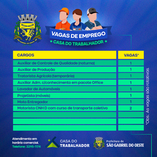 A Casa do Trabalhador em São Gabriel do Oeste funciona em horário comercial no prédio da Prefeitura Municipal na rua Martimiano Alves Dias, 1211. Mais informações, tanto para o contratante quanto para o candidato a uma vaga de emprego, podem ser obtidas pelos fones: 67 99827-5371, 67-3295-2018 ou 3295-1174.