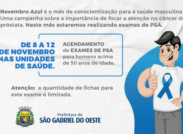 A Prefeitura de São Gabriel do Oeste, por meio da Secretaria Municipal de Saúde está oferecendo gratuitamente exames de PSA (que diagnostica alguns tipos de doenças), para homens a partir dos 50 anos de idade. A ação faz parte da Campanha Novembro Azul, que busca durante todo o mês de novembro, alertar os homens sobre a importância da prevenção e da realização de exames periódicos para a detecção precoce do câncer de próstata.