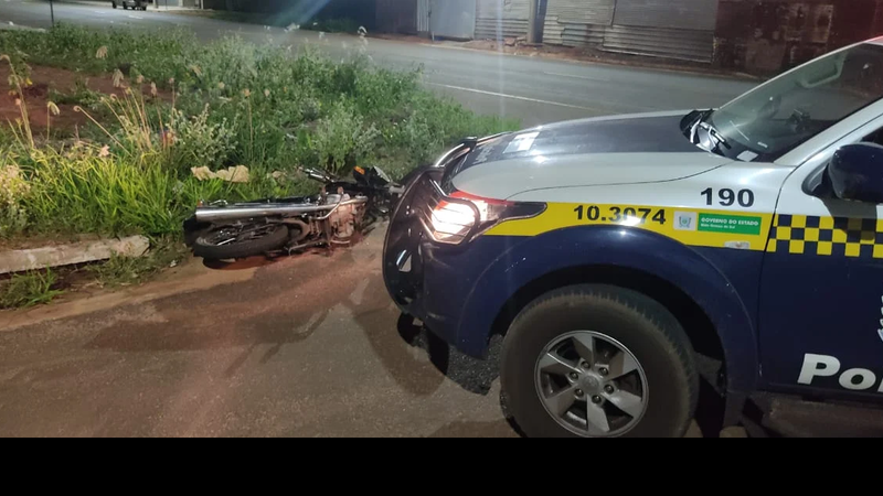 O condutor estava em alta velocidade, mas quando ele chegou no cruzamento da Avenida Ivinhema com a Rua Osvaldo Campesato, o motociclista perdeu o controle da motocicleta e caiu ao solo, momento em que a equipe policial conseguiu realizar a abordagem.