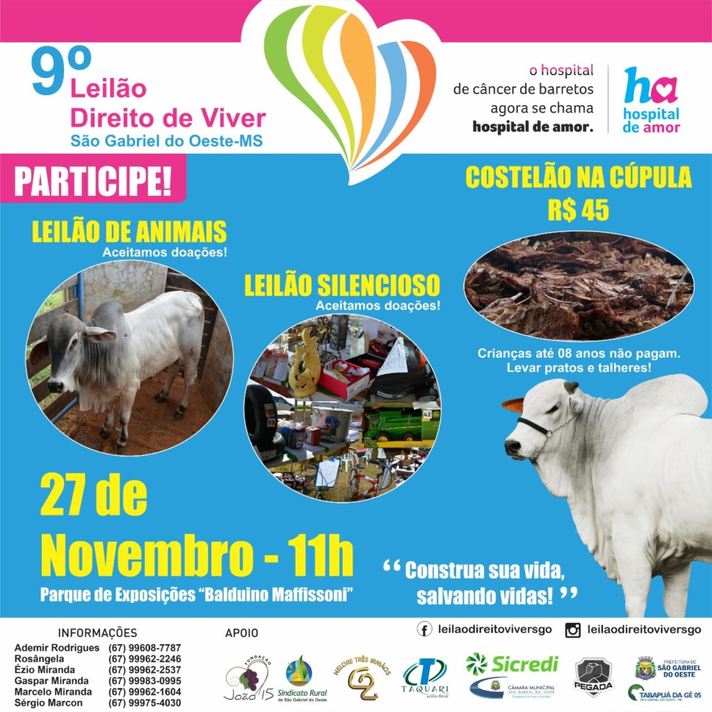 A 9ª edição do Leilão Direito de Viver acontece neste sábado (27), a partir das 11h em São Gabriel do Oeste. O evento, que será realizado no Parque Municipal de Exposições Balduíno Maffissoni, tem como objetivo angariar fundos para o Hospital de Amor de Barretos, que trata gratuitamente milhares de pessoas diagnosticadas com câncer no Brasil.