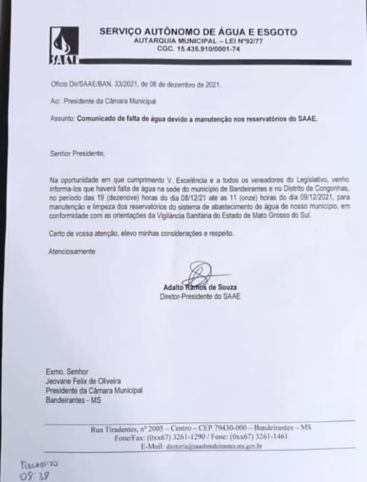 O Diretor-Presidente do SAAE de Bandeirantes , o Senhor Adalto Ramos de Souza  comunica a toda a população que hoje dia 08/12/2021 , haverá falta de água no município de Bandeirantes  e no Distrito de Congonhas , no periodo das 19 (dezenove) horas até as 11 (onze ) horas do dia 09/12/2021.