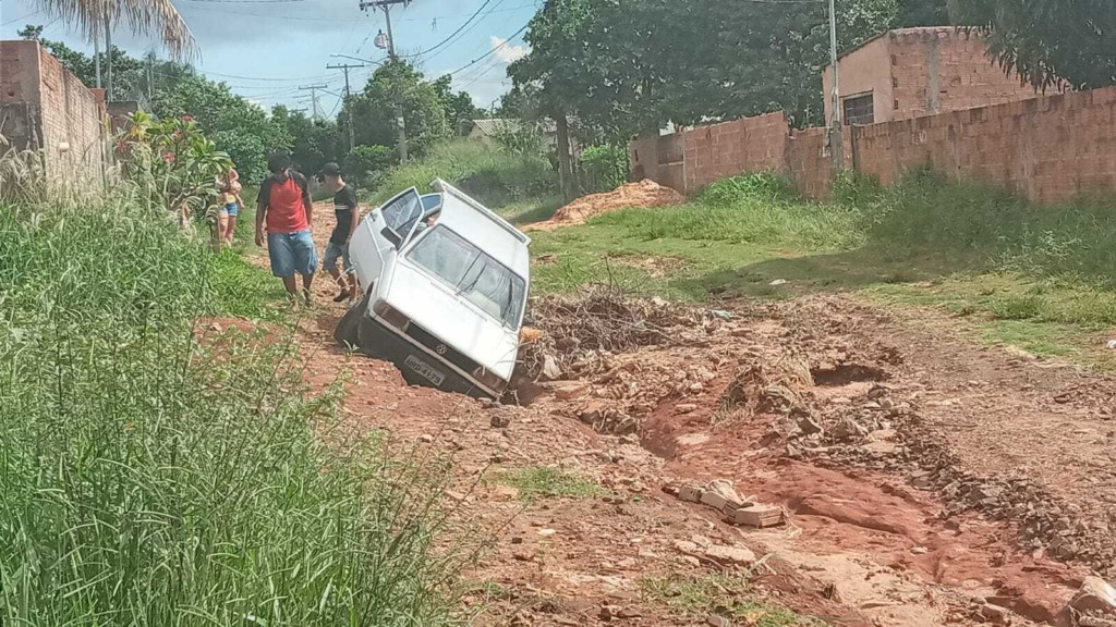 Flagrantes encaminhados à redação, mostram o “rio” que se formou pela rua durante as chuvas dos últimos dias. Há cerca de 15 dias, um veículo Gol quase tombou em um buraco e precisou ser puxado por outro motorista. Mas os transtornos não param por aí. Recentemente até o caminhão de coleta de lixo da Solurb ficou atolado pela rua.