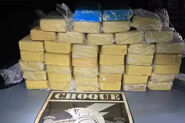Os policiais então fizeram vistorias na casa, quando encontraram duas caixas no quintal. Dentro, foram localizados 40 tabletes de cocaína, pesando 41,5 quilos.