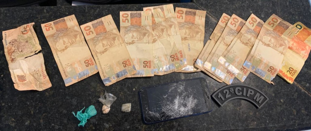 Diante das informações, os policiais militares realizaram rondas e localizaram uma motocicleta com as características informadas, sendo que o condutor apresentou nervosismo ao perceber a viatura. Foi realizada a abordagem e com o motociclista encontrado em um dos bolsos de sua bermuda uma trouxinha de substância análoga a pasta base de cocaína e uma trouxinha de substância análoga a maconha, além de R$ 570 em dinheiro.