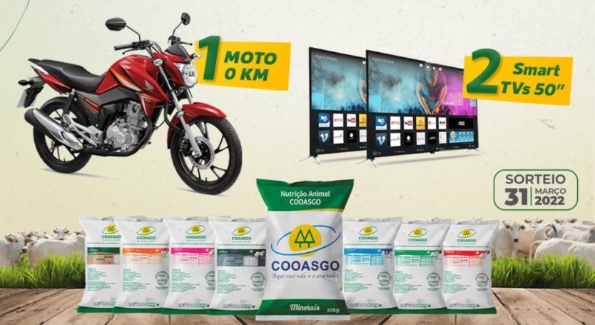 A promoção de lançamento da “linha de minerais COOASGO” está a todo vapor e você pode ganhar uma moto zero km e dois televisores de 50 polegadas. O sorteio vai acontecer no dia 31 de março e para concorrer é muito simples, compre produtos da linha de minerais COOASGO, ganhe cupons e responda a pergunta “Qual a cooperativa onde você vale mais o ano todo?”