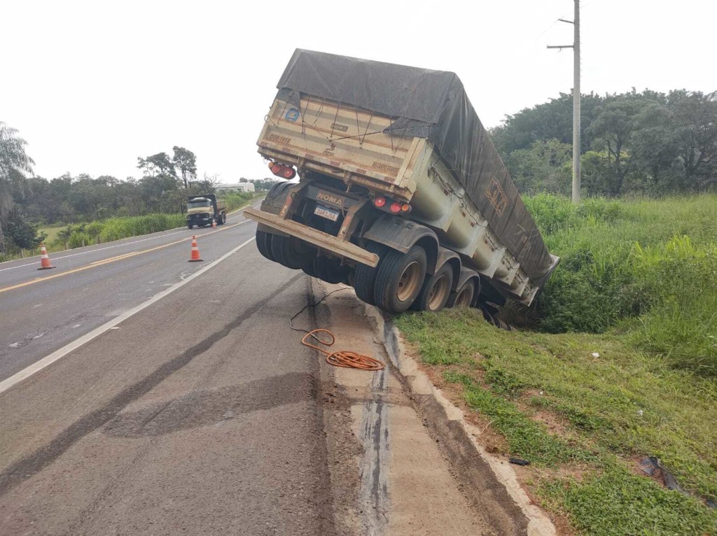 Um caminhão saiu de pista e ficou preso em uma valeta na BR-163, no macroanel viário de Campo Grande, depois de perder o freio e tentar desviar de veículos parados em semáforo. “Graças a Deus foi apenas dano material”, afirmou o caminhoneiro, Carlos Alberto, de 50 anos.