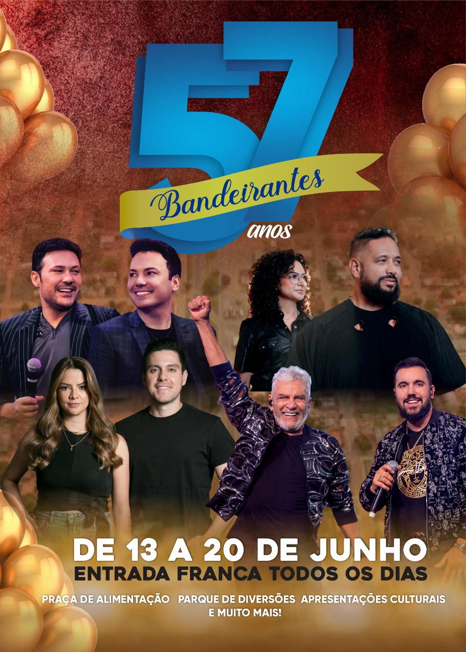 A programação de shows do aniversário de 57 anos de Bandeirantes começa nesta terça-feira (14), com apresentações de artistas locais e nacionais e segue até a próxima segunda (20).Serão sete dias de festa no Estádio Municipal Ananias Ferreira dos Santos.Entre as atrações principais estão a dupla João Bosco e Vinicius, o cantor gospel Fernandinho, a dupla Maria Cecília e Rodolfo e no dia do aniversário da cidade o show fica com MatoGrosso e Mathias. Os artistas locais, também terão espaço.