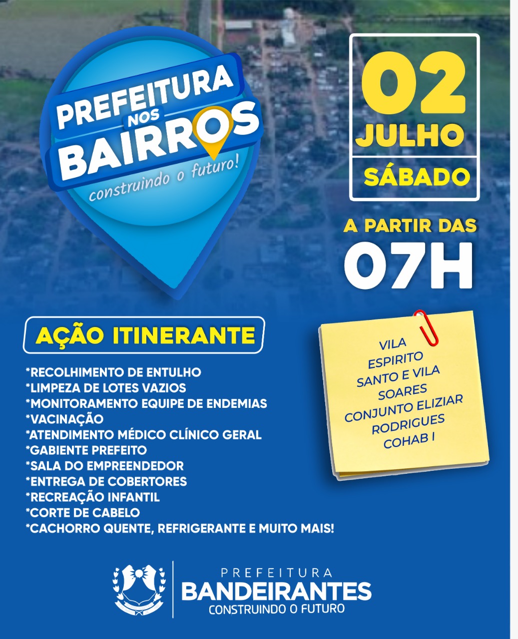 Com o objetivo de ampliar a comunicação com as comunidades para tornar mais eficiente as estratégias para solução de problemas e desafios nas políticas públicas implantadas no município, a Prefeitura Municipal de Bandeirantes estará, neste sábado (02), na Vila Espírito Santo, oferecendo atendimento também para os bairros Vila Soares, Conjunto Eliziar Rodrigues e Cohab I com o “Prefeitura nos Bairros”. O projeto, que tem por objetivo aproximar e colocar todos os serviços e atendimentos da administração municipal à disposição da comunidade, vai ser realizado a partir das 07 horas. Com a presença do prefeito Gustavo Sprotte e a vice prefeita Gediana Rocha e secretários.