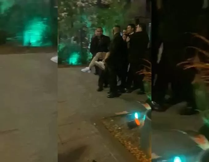 Vídeo enviado para a reportagem por meio do canal Direto das Ruas mostra o homem gritando e batendo no vidro. Em seguida, cinco seguranças se aproximam e seguram ele.