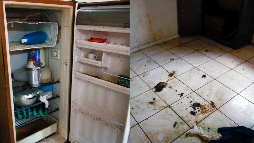 A poucos metros da porta de entrada é possível se incomodar com o forte odor que parte da casa. A pia da cozinha tomada de louças que não são lavadas há tempos, banheiro com vaso entupido, fezes e urina pelo chão, geladeira com crostas de comida estragada, panelas sujas sendo usada para cozinhar.