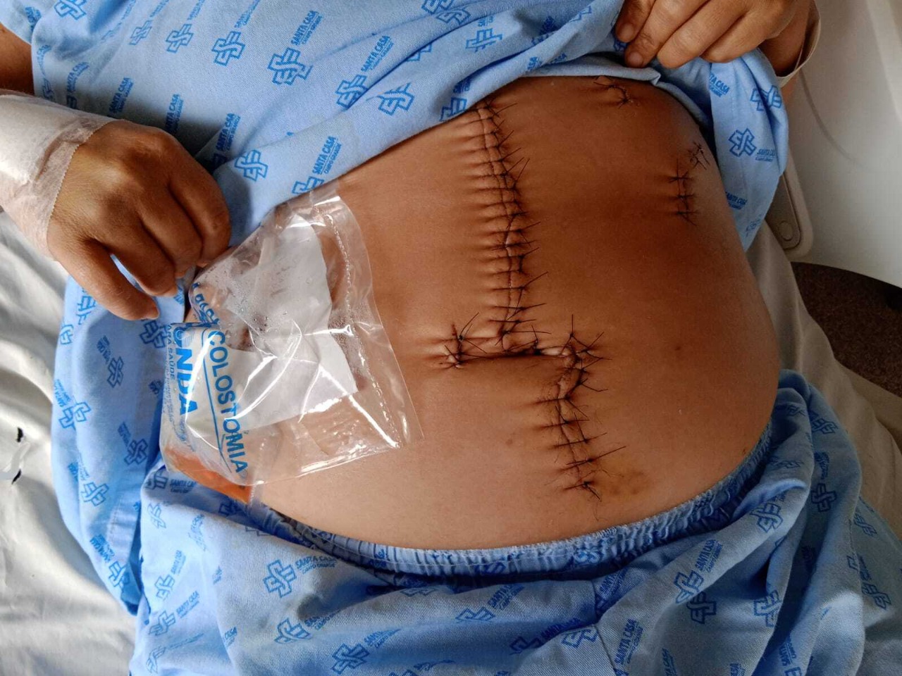 Segundo informações da Santa Casa, Evelyn segue internada na enfermaria, mas está consciente e orientada. Não tem alterações no quadro de saúde. Pela foto, é possível ver que foi preciso mais de 30 pontos para fechar as perfurações.