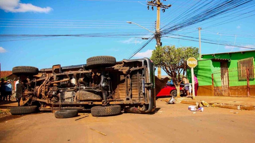 Conforme relato do motorista da Hilux, de 56 anos, ele descia pela Rua do Carimbó, quando no cruzamento com a Lírio dos Campos a camionete foi atingida na lateral direita pelo Gol. Com o impacto, a Hilux capotou duas vezes e parou tombada de lado.