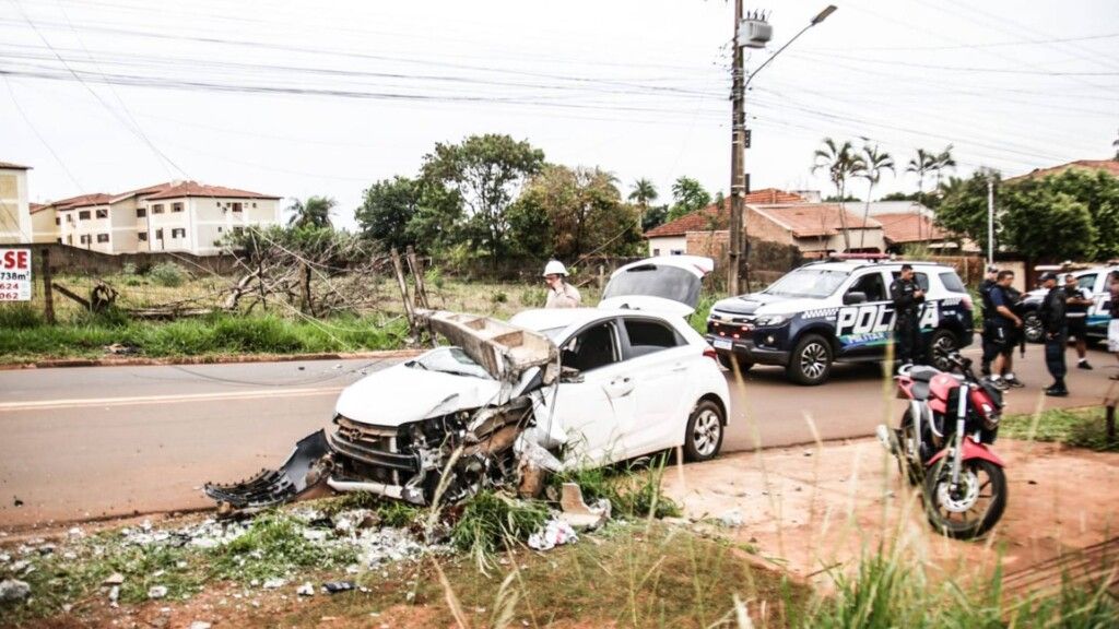 Perseguição acaba com HB20 derrubando poste em avenida de Campo Grande