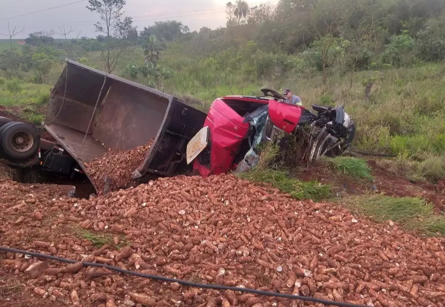 Um caminhão carregado com mandioca ficou completamente destruído após tombar à margem da MS-141, entre as cidades de Naviraí e Ivinhema, na tarde desta sexta-feira (14).