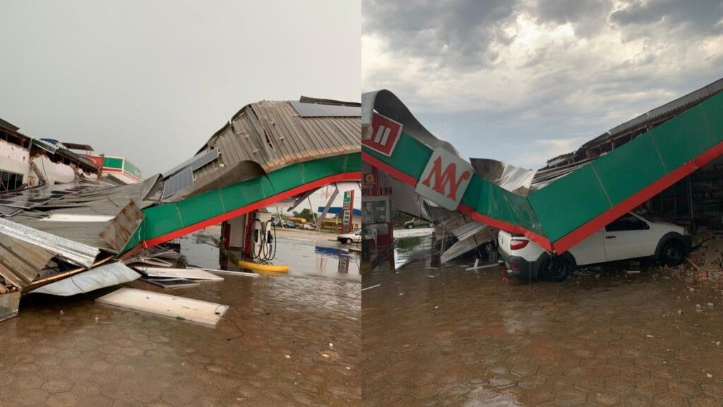 VÍDEO: Vendaval destrói cobertura de posto, que cai sobre carro em Bodoquena