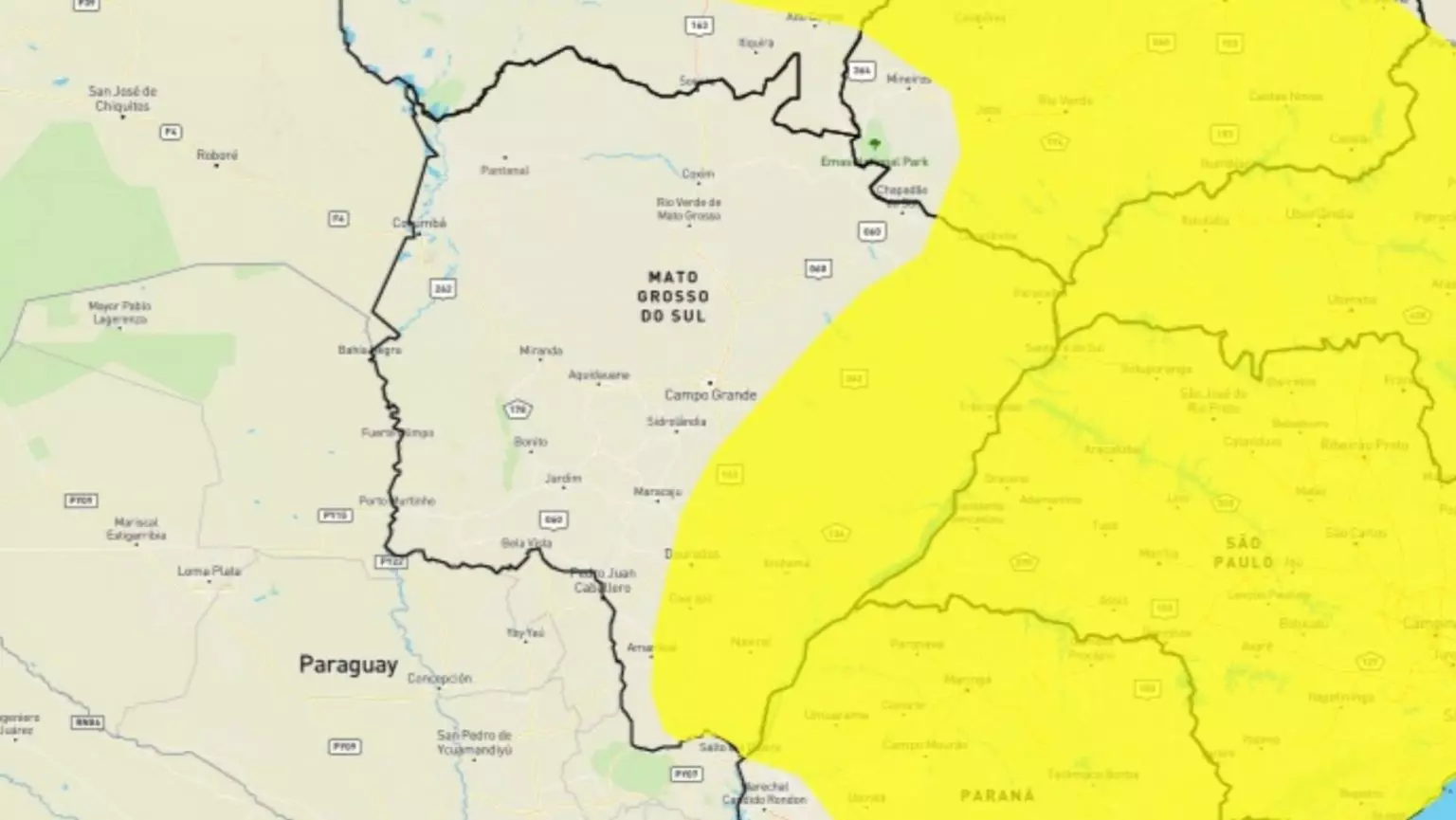 As cidades em alerta são: Água Clara, Amambai, Anaurilândia, Angélica, Aparecida do Taboado, Aral Moreira, Bataguassu, Batayporã, Brasilândia, Caarapó, Campo Grande, Cassilândia, Chapadão do Sul, Coronel Sapucaia, Deodápolis, Dourados, Eldorado, Fátima do Sul, Glória de Dourados, Iguatemi, Inocência, Itaporã, Itaquiraí, Ivinhema, Japorã, Jateí, Juti, Laguna Carapã, Maracaju, Mundo Novo, Naviraí, Nova Alvorada do Sul, Nova Andradina, Novo Horizonte do Sul, Paraíso das Águas, Paranaíba, Ponta Porã, Ribas do Rio Pardo, Rio Brilhante, Santa Rita do Pardo, Selvíria, Sete Quedas, Sidrolândia, Tacuru, Taquarussu, Três Lagoas e Vicentina.