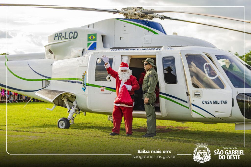 A aeronave que transportou a figura ilustre do Natal veio de Campo Grande e foi cedida pelo Governo do Estado de Mato Grosso do Sul, por meio da Casa Militar. “Nós agradecemos ao governador Reinaldo Azambuja e ao chefe da Casa Militar, coronel Nelson Antônio da Silva, por contribuir para que esse evento fosse único e memorável para todos os cidadãos são-gabrielenses”, pontuou o prefeito.