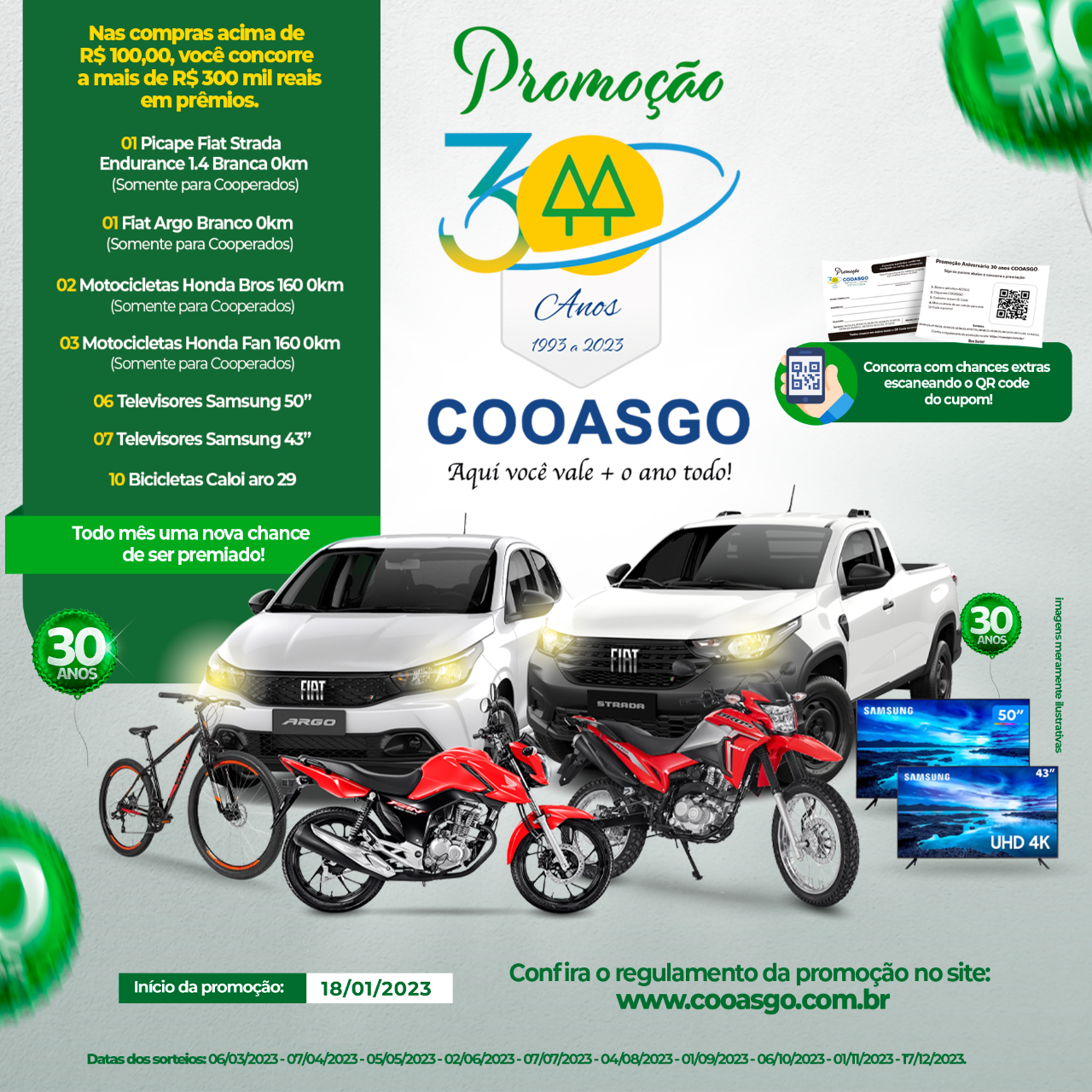 Lançada oficialmente nesta quarta-feira (18/01), a promoção de 30 anos da COOASGO vai sortear mais de R$ 300 mil em prêmios, incluindo dois veículos zero quilômetro (uma picape Fiat Strada e um Fiat Argo), além de 5 motocicletas, 13 televisores e 10 bicicletas.