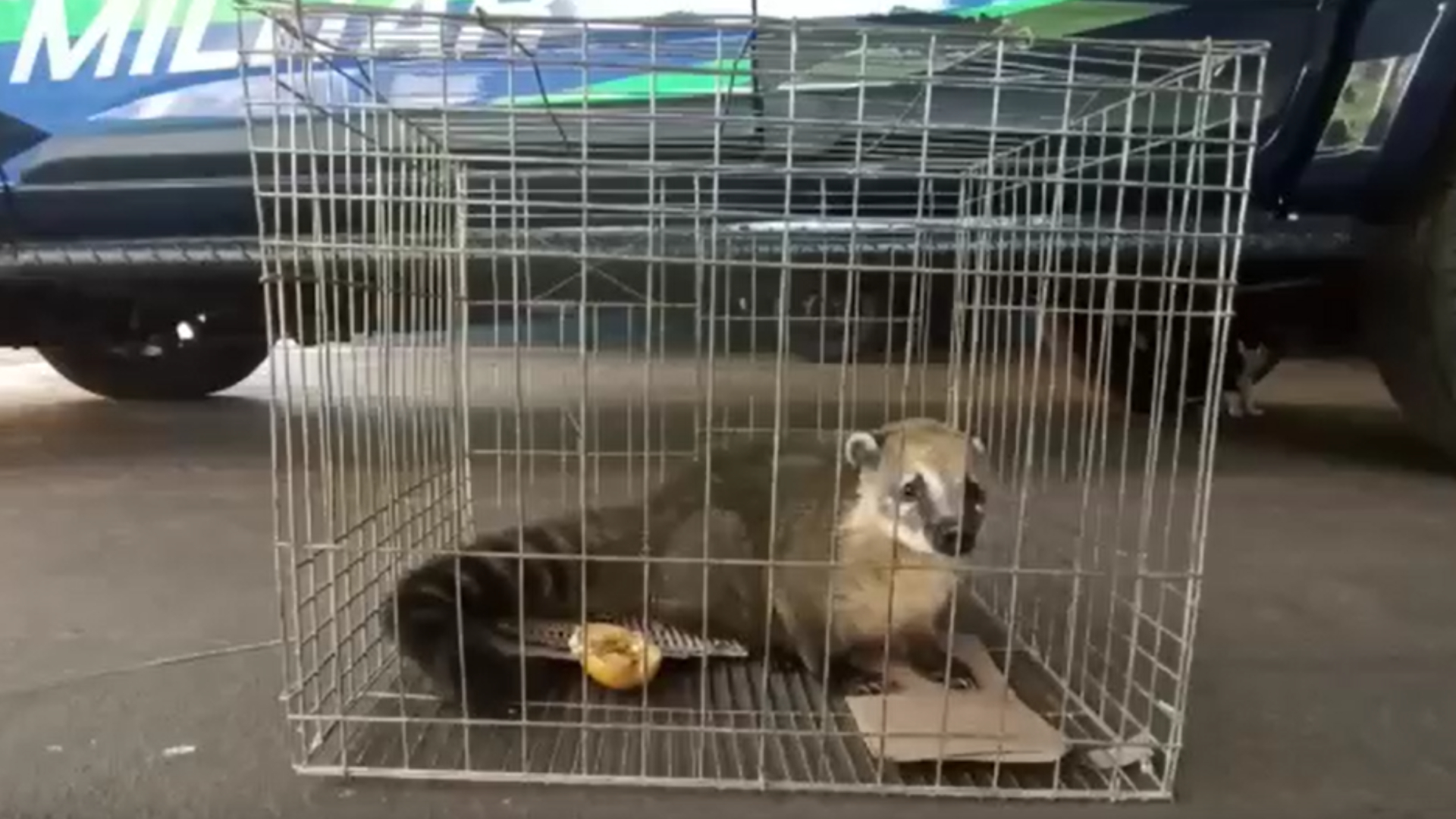Os policiais tamparam a caixa e transferiram o quati para uma caixa de contenção. Como o animal não apresentava ferimentos, a equipe realizou a soltura no mesmo dia em uma área de vegetação distante da cidade.
