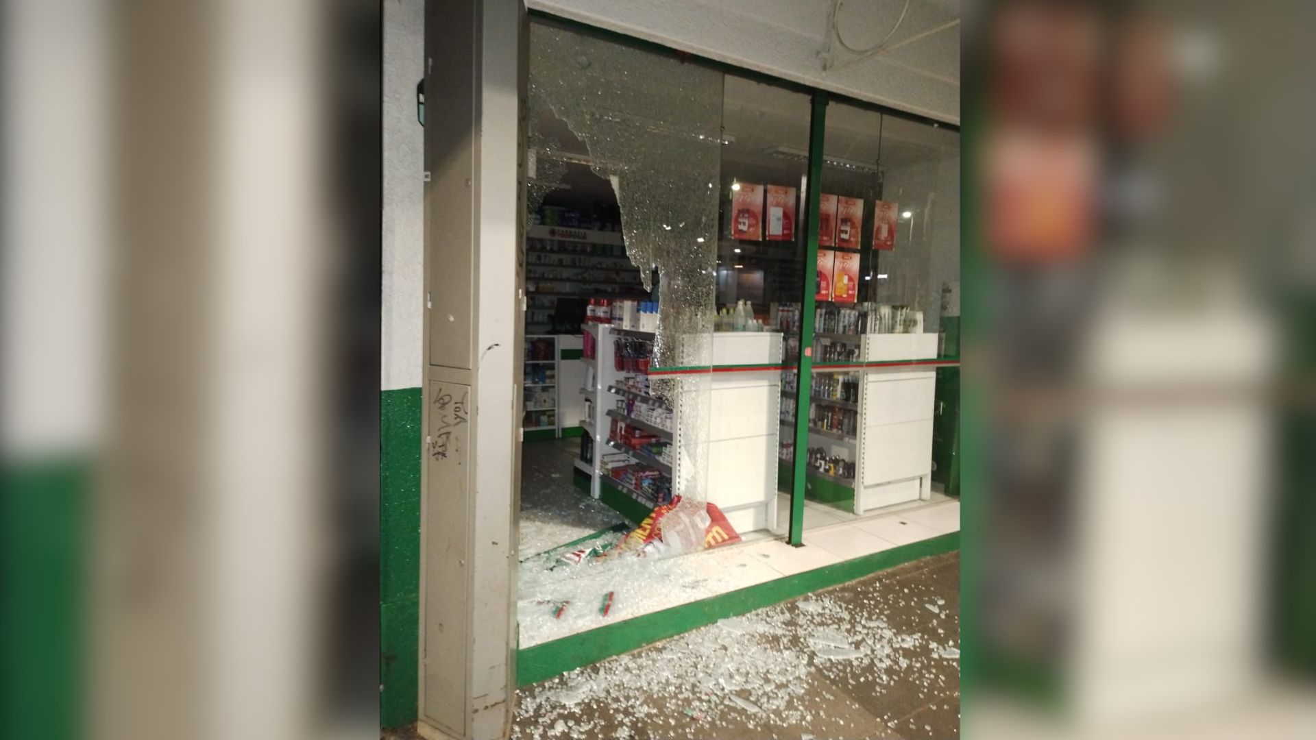 Imagens feitas na loja mostram estilhaços de vidro espalhados por todo o estabelecimento. As gavetas dos caixas também foram arrombadas pela dupla.