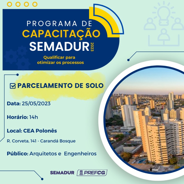 A Prefeitura de Campo Grande realiza nesta quinta-feira (25), a terceira edição do Programa de Capacitação da Secretaria Municipal de Meio Ambiente e Gestão Urbana (Semadur), desta vez voltada ao Parcelamento do Solo, momento em que os profissionais poderão sanar suas dúvidas e receber orientações quanto à elaboração de projetos na temática apresentada. O público alvo são profissionais arquitetos e engenheiros.