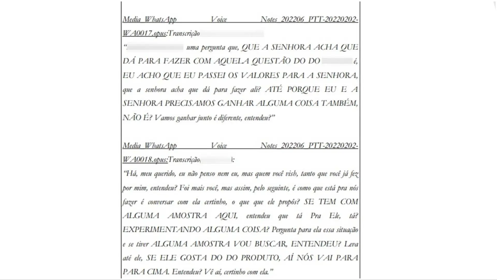 Já em uma das conversas da chefe do RH com o advogado, ele demonstra preocupação com o valor repassado ao traficante para a negociação da droga. “DONA XXX, uma pergunta que, QUE A SENHORA ACHA QUE DÁ PARA FAZER COM AQUELA QUESTÃO DO DO XXX é, EU ACHO QUE EU PASSEI OS VALORES PARA A SENHORA, que a senhora acha que dá para fazer ali? ATÉ PORQUE EU E A SENHORA PRECISAMOS GANHAR ALGUMA COISA TAMBÉM, NÃO É? Vamos ganhar junto é diferente, entendeu?”