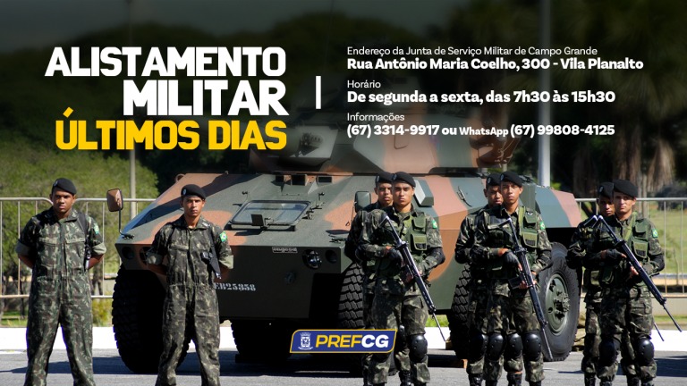 A Junta de Serviço Militar de Campo Grande fica na Rua Antônio Maria Coelho, 300, Vila Planalto. O horário de atendimento é das 7h30 às 15h30, de segunda a sexta. Mais informações podem ser obtidas pelo telefone (67) 3314-9917 ou via WhatsApp (67) 9 9808-4125.