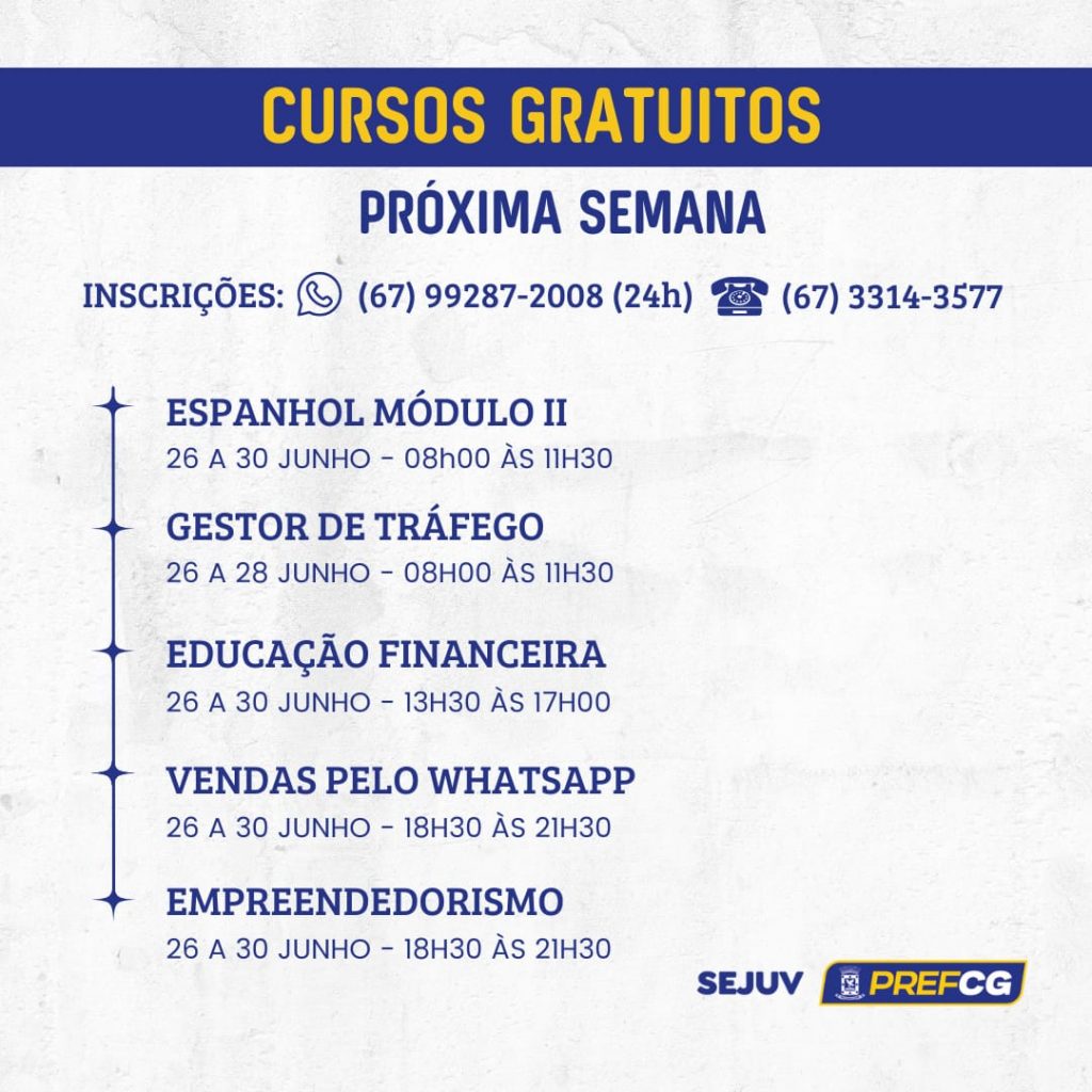 As qualificações terão início na segunda-feira (26) e se encerram na sexta-feira (30), com exceção do curso de “Gestor de Tráfego”, que vai terminar na quarta-feira (28).
