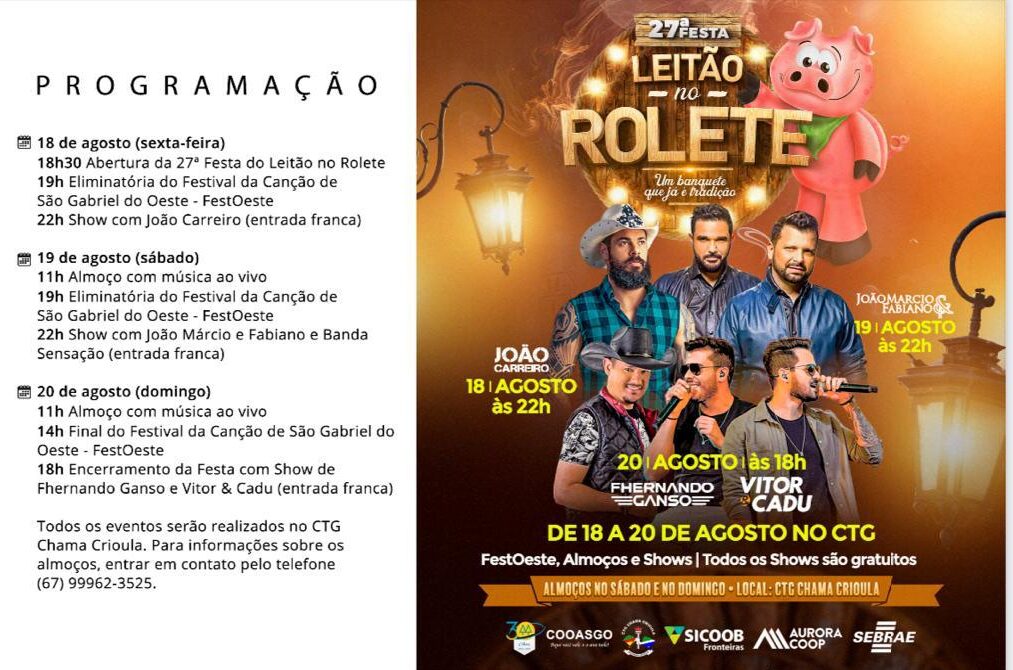 – 18h – Encerramento da Festa com Show de Fhernando Ganso e Vitor & Cadu (entrada franca)