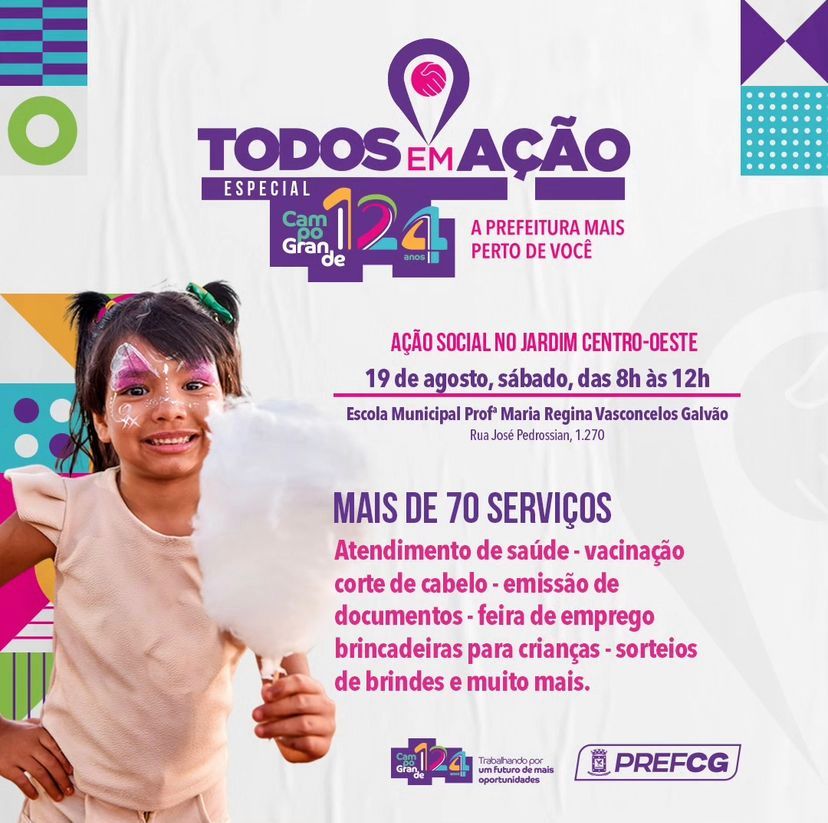 Em comemoração ao aniversário de 124 anos de Campo Grande, acontece neste sábado (19), mais uma edição de 2023 do Programa “Todos em Ação – a Prefeitura Mais Perto de Você”. Dessa vez, o mutirão que oferece diversos serviços estará no Bairro Jardim Centro Oeste. O evento começa às 8h, na Escola Municipal Professora Maria Regina de Vasconcelos Galvão, na Rua José Pedrossian, 1.270, e segue até às 12 horas.