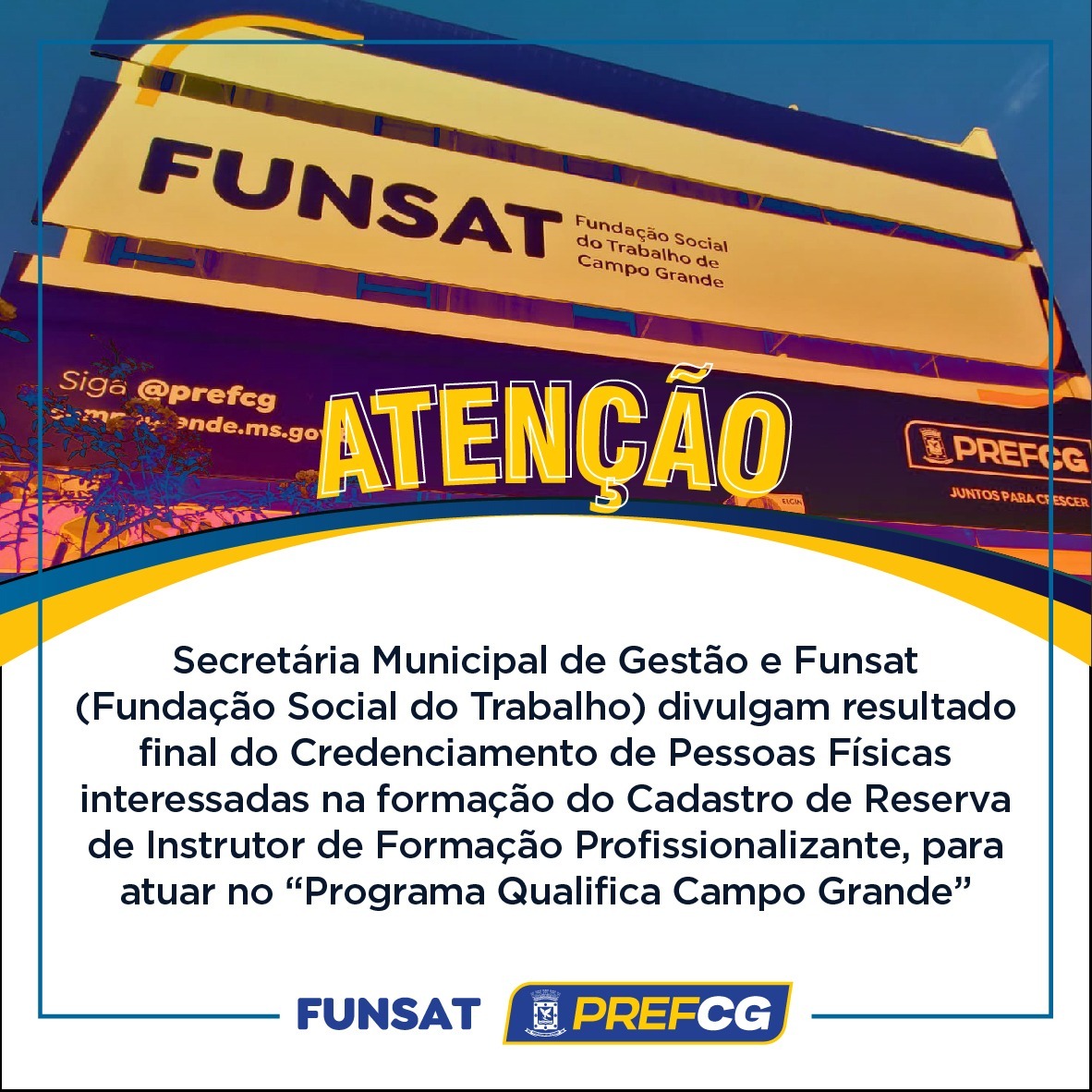 A Secretária Municipal de Gestão e a Funsat (Fundação Social do Trabalho de Campo Grande), após análise da documentação de habilitação entregue pelos candidatos inscritos, divulgaram nesta sexta-feira (18), o resultado final do credenciamento de pessoas físicas interessadas na formação do Cadastro de Reserva de Instrutor de Formação Profissionalizante, para atuar no “Programa Qualifica Campo Grande” no âmbito da Escola de Educação Profissional da Funsat.