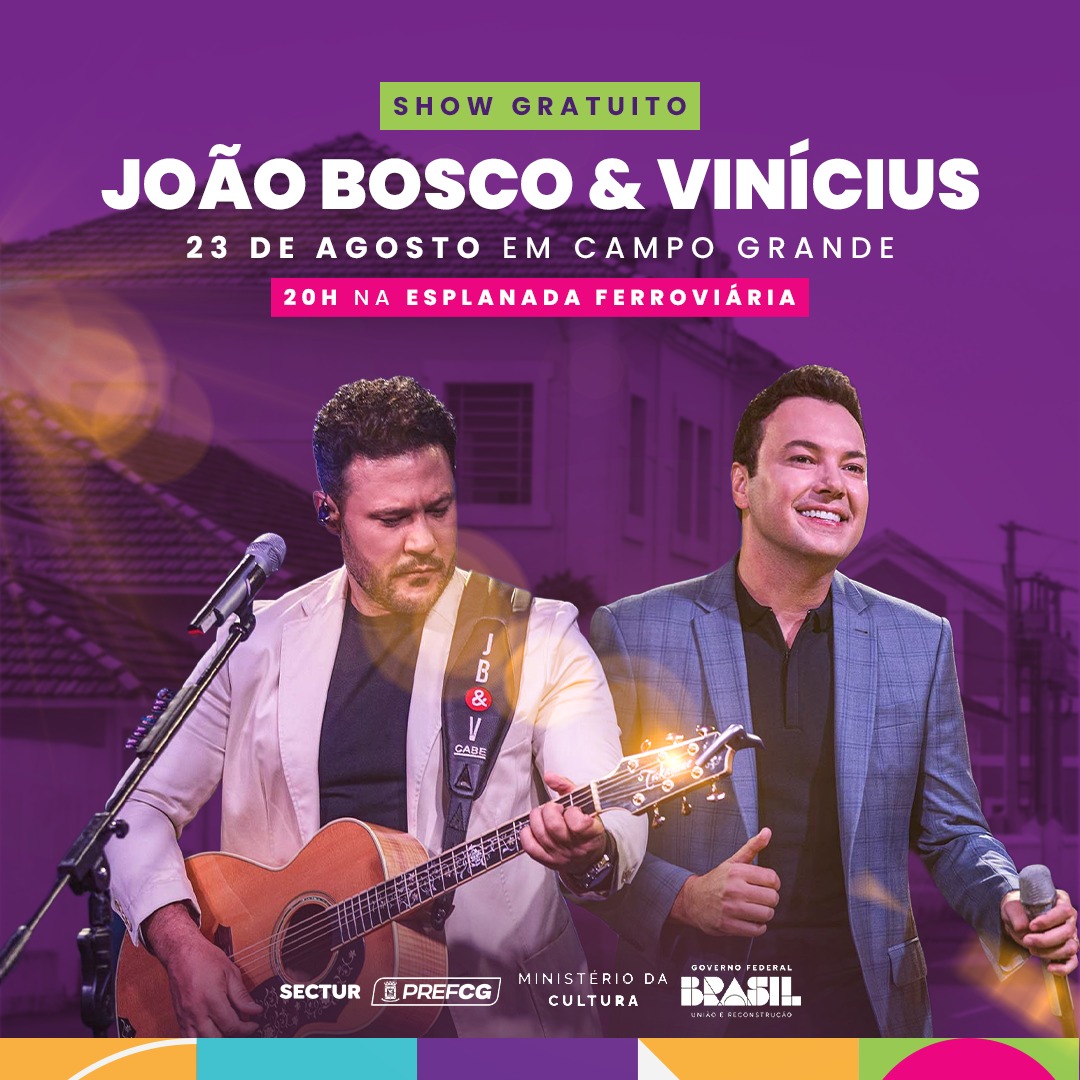 A dupla pioneira do sertanejo universitário no Brasil, João Bosco e Vinícius, vai abrir a programação do 1º Festival Reviva Mais Campo Grande 124 anos Cultura e Turismo que acontece nesta quarta-feira (23), reunindo música, artes cênicas, artes visuais, gastronomia, economia criativa e turismo.