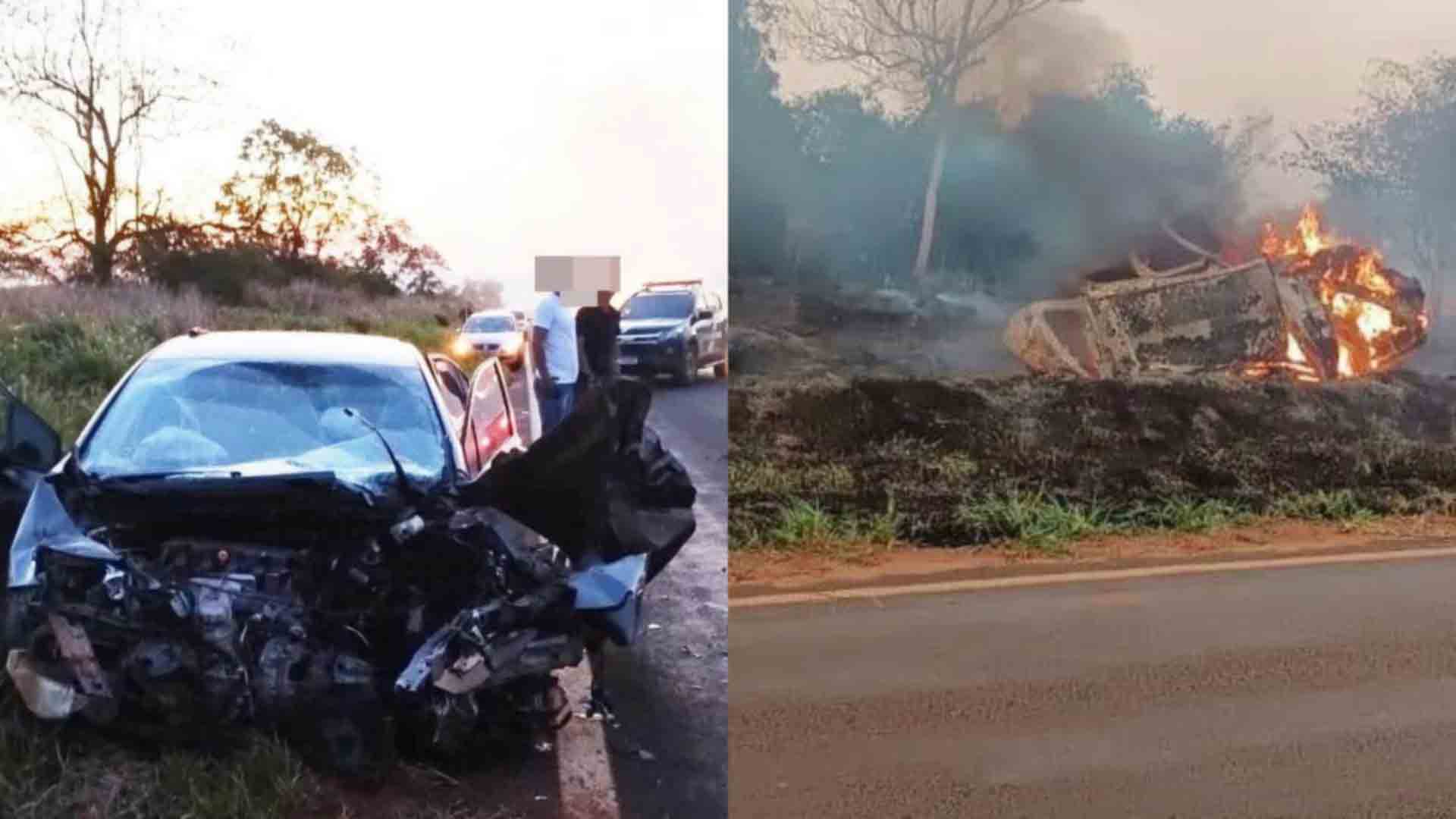 O acidente aconteceu no fim da tarde de domingo (22), quando os dois carros bateram, sendo que um deles foi parar em meio a um matagal pegando fogo ficando destruído. O outro veículo teve a parte da frente destruída.