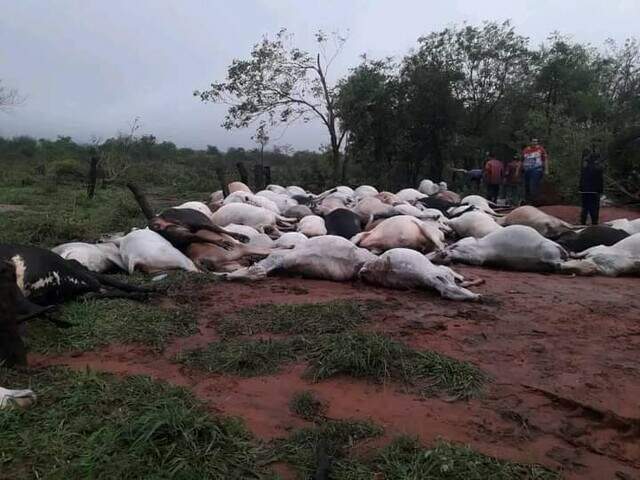 Pelo menos 80 bois e dois cavalos morreram após serem atingidos por raio nesta sexta-feira (27) em uma fazenda na Colônia Ybyrarobaná, no departamento de Canindeyú, no Paraguai, O local fica a 28 quilômetros do município de Sete Quedas (MS).