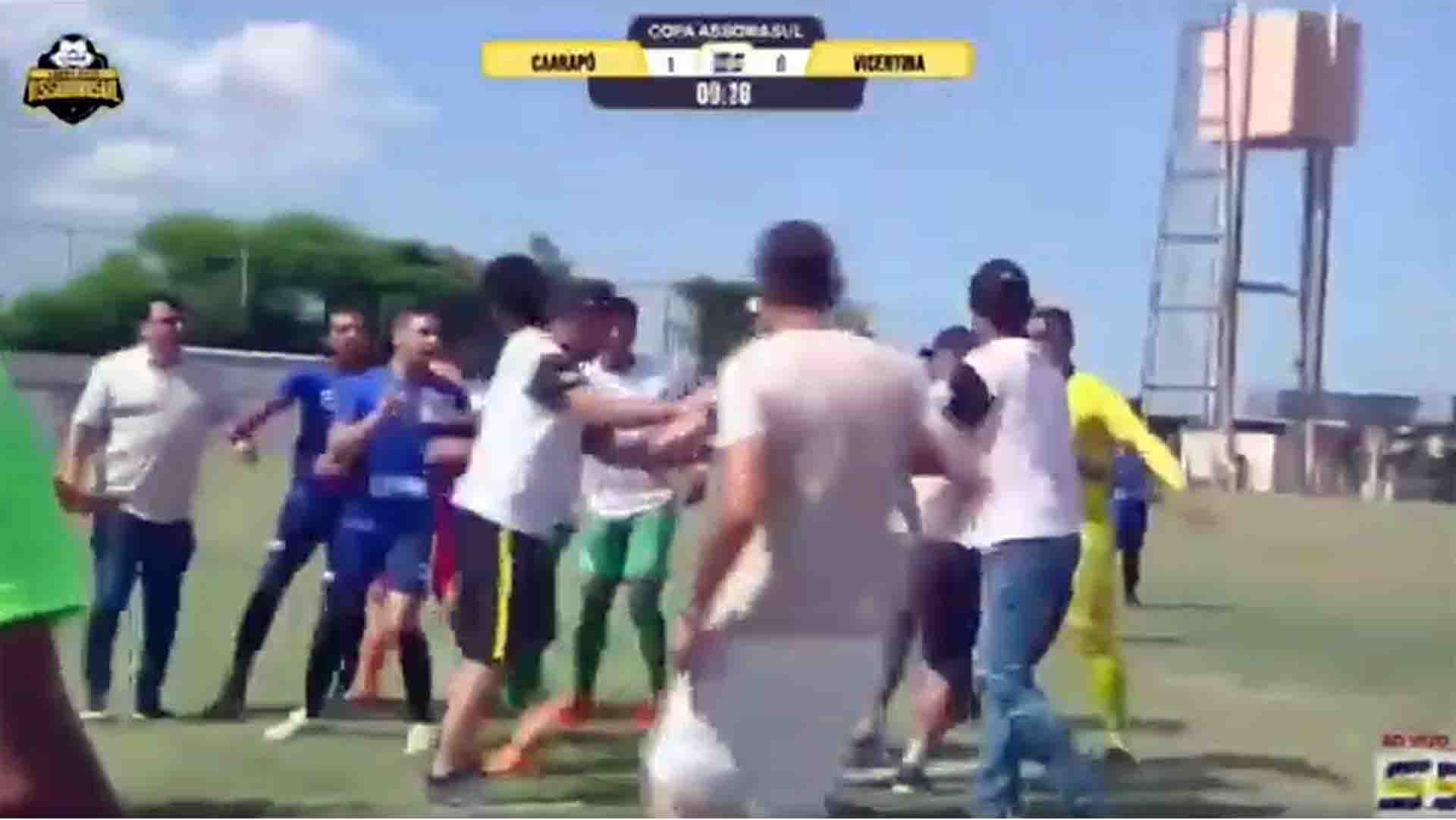 Não era nenhum lance no gramado, e sim uma briga entre os prefeitos das duas cidades. As cenas lamentáveis com direito a chutes, palavrões e acusações levaram à suspensão da partida. Além disso, geraram troca de acusações entre os envolvidos.