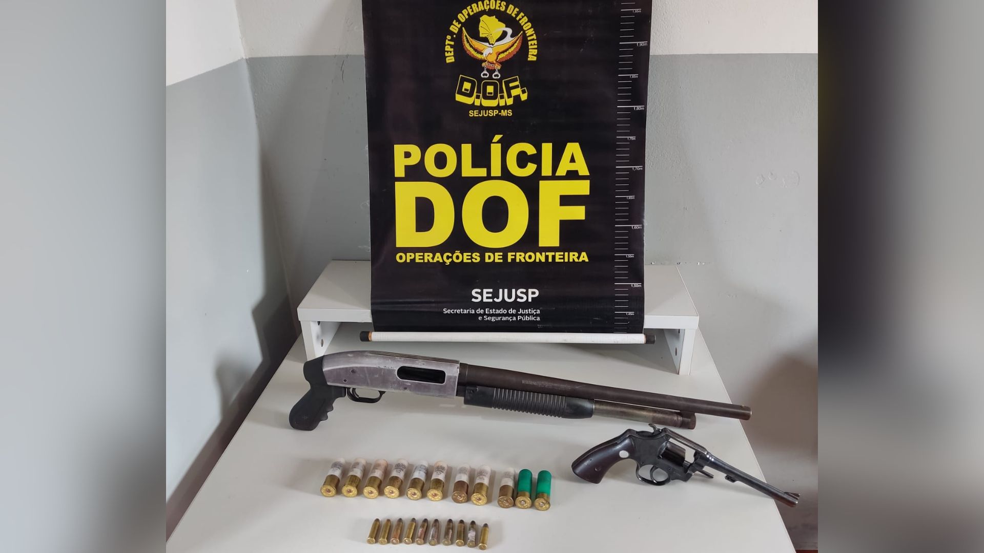 O DOF (Departamento de Operações de Fronteira) apreendeu duas armas, sendo um revólver calibre .38 e um espingarda calibre 12, na posse de um idoso, em Antônio João. O suspeito foi preso em flagrante. A ação policial ocorreu no último domingo (31), quando policiais também recapturaram um foragido da Justiça.
